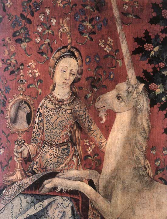 Interestingly enough I have been doing the same thinking, on the same questions as the human being that I am. I did not know about the myth that had been retold and captured in a tapestry by an artist in Flanders sponsored by an important individual at the court of Charles VIII. The why of the creation of the tapestries is unknown. The tapestries were found in 1841 by Prosper Merimee in Boussac castle. Then written about again by a woman by the name of George Sand.